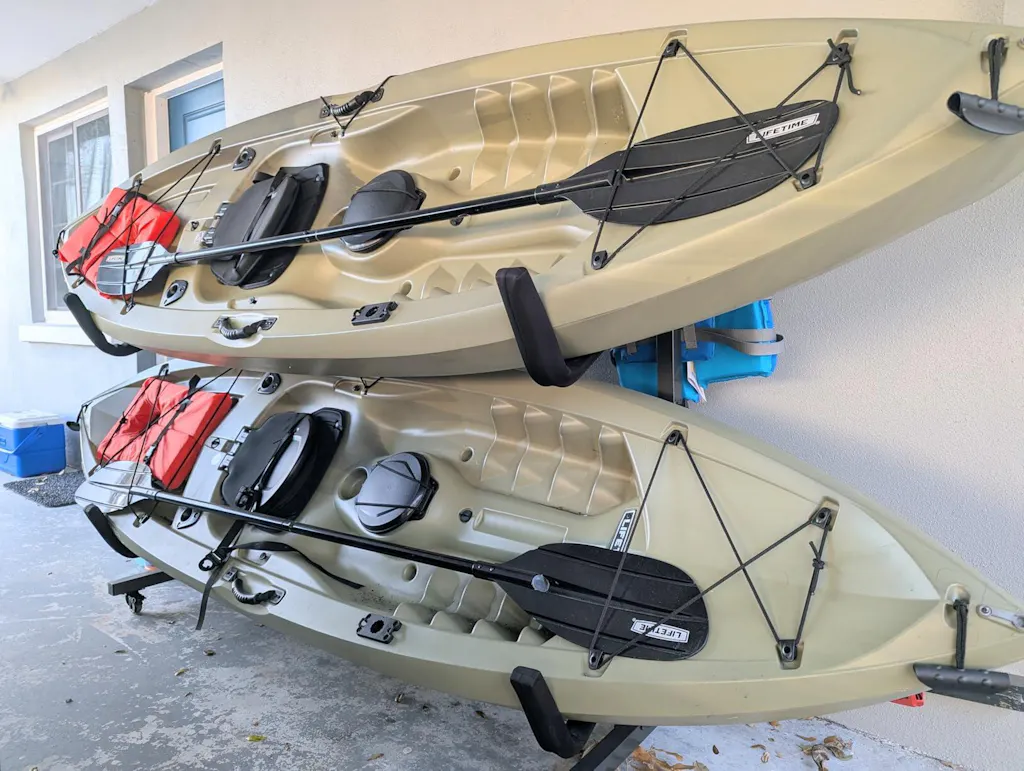 Kayak Floor Rack:This rolling kayak rack has 4 lockable wheels to be able to move the until without taking everything off. So you can easily move it around anywhere you want such as garage, boat house, shed or dock.